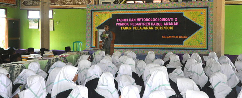 Sukorejo/da.com- Pondok Pesantren Darul Amanah merupakan salah satu dari berbagai lembaga pendidikan keagamaan yang menggunakan metode Qiro’ati untuk mengajarkan belajar membaca Al- Qur’an dengan baik dan benar. Selain metode Qiro’ati ini diajarkan kepada santri, khusus para santri kelas 6 TMI mereka diberi pengajaran tentang bagaimana mestinya mengajar Qiro’ati. Mereka diberi pelatihan tentang cara mendirikan TPQ, cara mengelolanya dan cara mengajar dengan metode Qiro’ati. Hal ini bertujuan agar ketika lulus nanti mereka siap dan sudah bisa jika diminta untuk menjadi guru Qiro’ati di masyarakat. Dalam metode ini, seseorang akan syah menjadi guru TPQ atau Qiro’ati jika telah dinyatakan lulus dalam Ujian Tashih. Ujian Tashih merupakan salah satu cara untuk mengetahui kemampuan, sudah layakkah untuk menjadi guru TPQ . Kegiatan tashih ini dilaksanakan 2 gelombang, gelombang pertama telah dilaksanakan pada Desember lalu, untuk gelombang kedua dilaksanakan pada hari Rabu ( 22/05) kemarin dengan peserta Ujian dari para santriwan dan santri putri kelas 6 TMI yang pada gelombang satu belum lulus atau belum mengikuti, beserta dewan asatidz dan ustadzah yang belum mengikuti Tashih Qiro’ati. Tim penguji dlaam Tashih 2 ini masih sama dengan Tashih pertama yaitu dari Korcab. Selain Tashih Qiro’ati, bagi para santri kelas 6 TMI juga mendapatkan Metodologi atau pelatihan metode Qiro’ati 2 sebagai lanjutan Metodologi 1 yang dilaksanakan pada hari Kamis ( 23/05) dengan materi Jilid 4, 5, 6 dan Ghorib oleh KH. Ibnu Mas’ud Al- Khafidz dari Korcab Kendal.